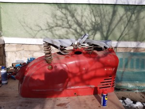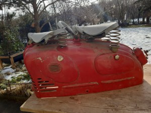 Alle Blechteile und der Rahmen werden vom Lack befreit (Sand und/oder CO2 gestrahlt) und mit dem zur Type passenden Lack neu versehen.